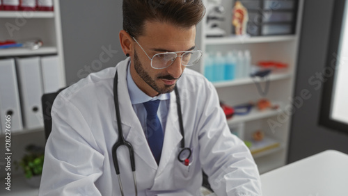 doctor, hispanic, male, hospital, clinic, stethoscope, portrait, indoor, workplace, man, medicals, health care, profession, medicine, office, interior, professional, desk, attaching, goggles, focused, serious, young, adult, consultation, nurse, treatment, patient, health, shelf, book, equipment, practice, appointment, service, therapy, aid, support, examine, survey, diagnose, inpatient, outpatient, staff, resource, uniform, care
