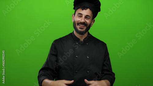 Hispanic man chef with a beard gestures in front of a bright green background wearing a black uniform and hat showcasing culinary expertise.