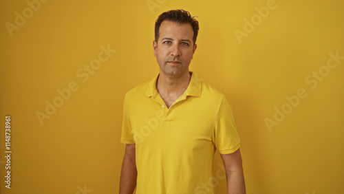 Hispanic man in a yellow shirt standing against an isolated yellow background