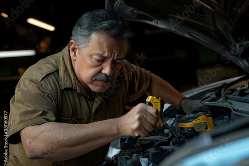 hispanic, man, moustache, repairing, car, garage, photorealistic, mechanical, person, service, lighting, studio, technician, working, maintenance, workshop, vehicle, engine, auto, shop, job, male, inspection, motor, automobile, occupation, transportation, business, uniform, check, automotive, tool, fix, professional, wrench, part, young, adult, men at work, labor, manual, station, repairman, maintain, profession, hood, oil, change, latin