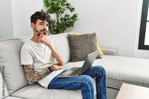 Hispanic man with beard sitting on the sofa looking confident at the camera with smile with crossed arms and hand raised on chin. thinking positive.
