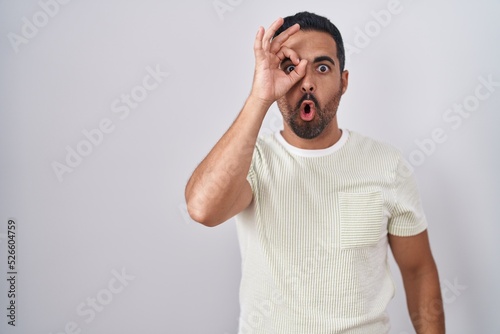 background, beard, doing, expression, face, finger, gesture, hispanic, isolated, looking, man, ok, shocked, standing, through, unbelieving, adult, amazed, approve, casual attire, cheerful, confident, eye, finger, fun, hand, happiness, happy, humor, latin, look, male, person, portrait, positive, shock, signs, studio, surprise, view, vision, wow