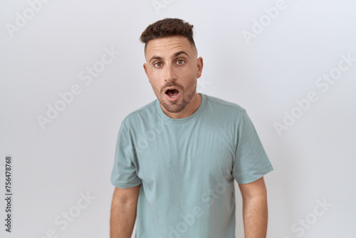 Hispanic man with beard standing over white background afraid and shocked with surprise and amazed expression, fear and excited face.
