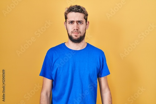 Hispanic man with beard standing over yellow background skeptic and nervous, frowning upset because of problem. negative person.