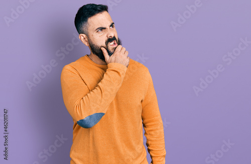 Hispanic man with beard wearing casual winter sweater thinking worried about a question, concerned and nervous with hand on chin