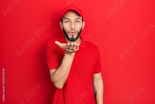 Hispanic man with beard wearing delivery uniform and cap looking at the camera blowing a kiss with hand on air being lovely and sexy. love expression.