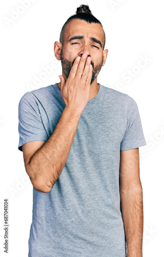 Hispanic man with ponytail wearing casual grey t shirt bored yawning tired covering mouth with hand. restless and sleepiness.