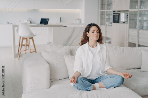Hispanic woman practicing yoga, meditates, doing breathing exercises on comfortable sofa at home