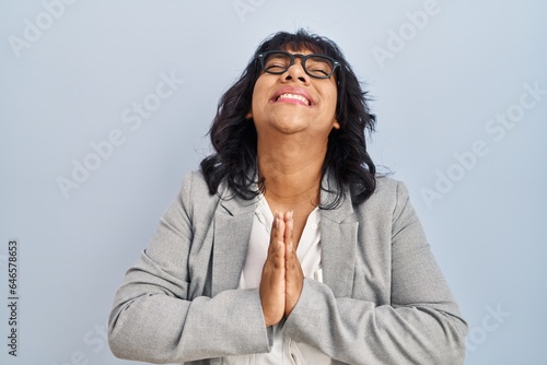 Hispanic woman standing over isolated background begging and praying with hands together with hope expression on face very emotional and worried. begging.
