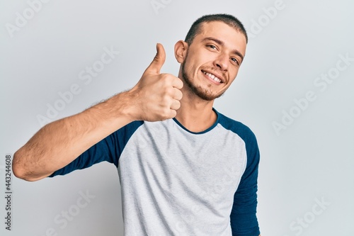 Hispanic young man wearing casual clothes doing happy thumbs up gesture with hand. approving expression looking at the camera showing success.