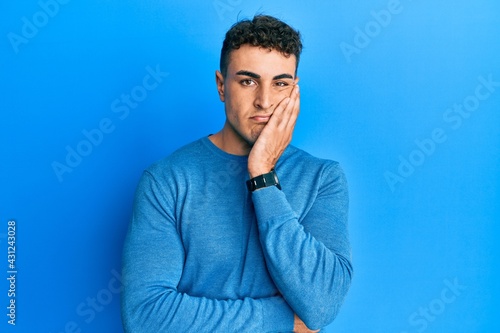 arm, bored, casual attire, crossed, depression, hispanic, looking, man, sweater, thinking, sleepy, wearing, winter, young, adult, annoyed, arm, background, blue, boredom, boring, cool, curly hair, depressed, expression, face, fashion, hand, photogenic, head, jumper, latin, lazy, lifestyle, male, people, person, portrait, problem, sad, sleep, sleepy, standing, stress, studio, style, tedious, unhappy