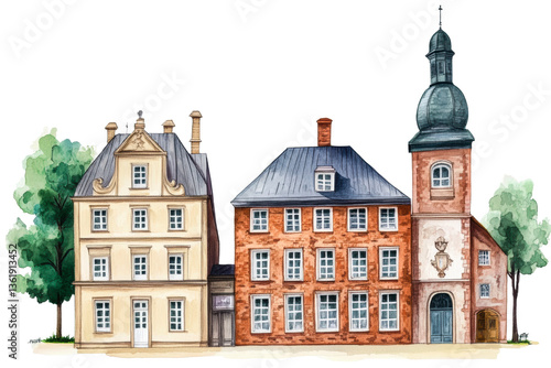 Historic architecture german town watercolor vibrant scene isolated on transparent background