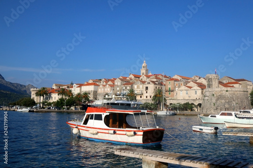 beautiful, idylli, street, shore, boat, day, sky, clear, blue, bright, church, bell tower, tower, tile, stone, roof, house, fortress, fort, historical building, landmark, heritage, attraction, location, destination, summer, holiday, vacation, holiday maker, tour tourism, travel, historical, historic, old, building, architecture, skyline, city landscape, city landscape, city, town, island, coast, sea, mediterranean, adriatic, europa, dalmatia, croatia, korcula
