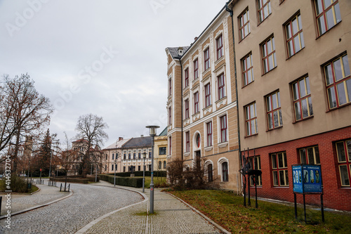 Historical building of Secondary School of Applied Arts and Higher Vocational School, cityscape of medieval town in winter day, Bohemian Paradise, Turnov, Czech Republic