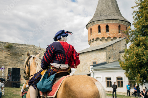 historical reconstruction hobby passion picture of medieval male rider on horse back to camera in castle yard space with fortress tower background landmark view