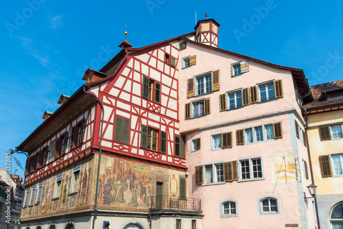 Historical tenement house (apartment building) with facade paintings and half timbered walls in an old town in Swiss city Stein am Rhein in Switzerland