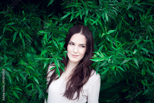 woman, woman, glance, posture, leaf, background, hair, beauty, brunette, young, mood, emotion, lock, intrigue, smile, oval, white, skin, blank, age, svelte