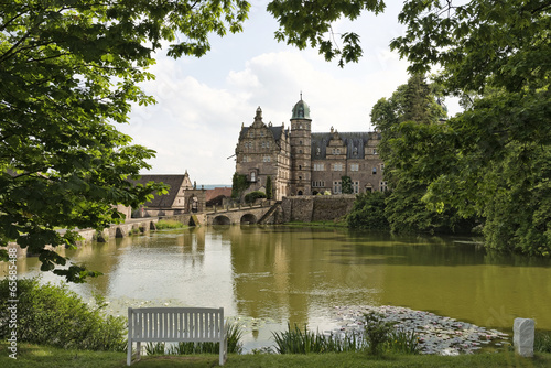 castle, 16, century, fortress, lock, sandstone, hamelin, lower saxony, german, historic, famous, touristy, tourist attraction, water, see, dig, fosse, tree, green, summer, spring, bench, white, rest, seat, ease, recreation, stillness, idylli, fairy tale