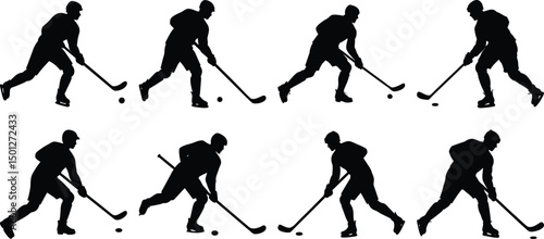 hockey, playing, silhouette, set, collection, sport, vector, transparent, background, ice, field, game, player, team, stick, puck, goal, shooting, sk8, defense, attack, goalie, action, movement, competition, tournament, league, black, white, shadow, outline, minimal, simple, flat, design, graphic, illustration, isolated, athlete, uniform