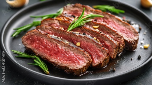 Hokkaido wagyu beef steak, seared and sliced, topped with garlic slices, rosemary, thick brown sauce, and fine truffle flakes