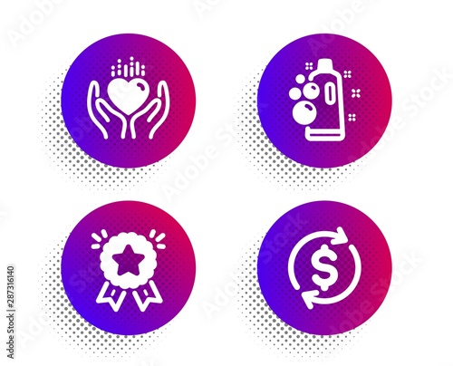 Hold heart, Clean bubbles and Ranking star icons simple set. Halftone dots button. Usd exchange sign. Care love, Laundry shampoo, Winner medal. Currency rate. Business set. Vector