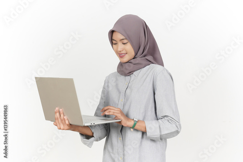 Holding and Using Laptop Of Beautiful Asian Woman Wearing Hijab Isolated On White Background