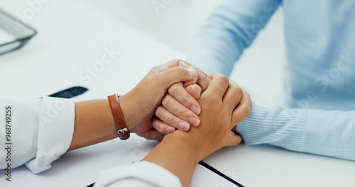 Holding hands, doctor and patient on consultation with support for feedback or report on diagnosis. People, medical practitioner and closeup for advice, help and communication with kindness at clinic