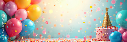 Holiday card. Vibrant and colorful celebration scene, featuring a large number of colorful balloons, confetti, and a small cake with a gold star on top.
