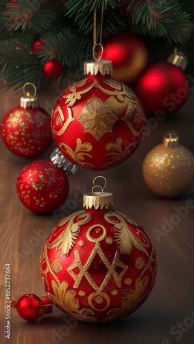 Holiday Decor with Red and Gold Christmas Ornaments on Pine Tree, Luxurious and high-end Christmas tree decorations close-up