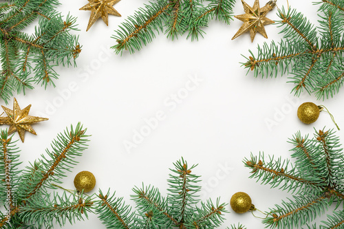 Holiday frame of Christmas decorations on white background with fir branch, gold and red balls, stars. Elegant New Year`s snowy card. Top view. Flat lay.