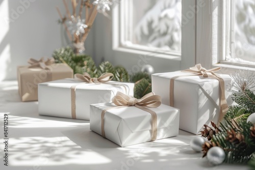 holiday, season, gift, present, snowy, window, sill, white, wrapped, bow, ribbon, decorative, christmas, festive, winter, celebration, decor, indoor, natural light, serene, peaceful, greenery, evergreen, pine, silver, ornament, rustic, elegant, minimalist, traditional, seasonal, cardboard box, surprise, joyful, occasion, snow, flurry, shadow, morning, sunlight, happy, decoration, cosy, warm, soft light, wrapping paper, simple, chic, graceful