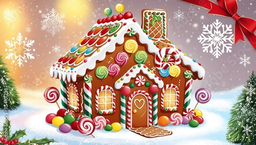 Holiday-Themed Gingerbread House Adorned with Sweets and Snow