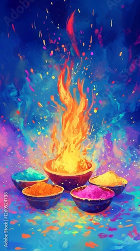 Holika Dahan watercolor illustration with fire and colorful powder in bowls.