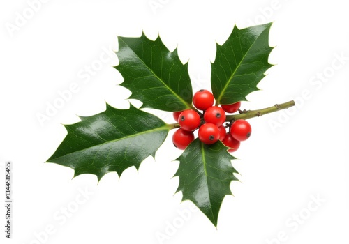 Holly Sprig with Red Berries - A sprig of holly with vibrant red berries, isolated on a white background. Perfect for holiday designs