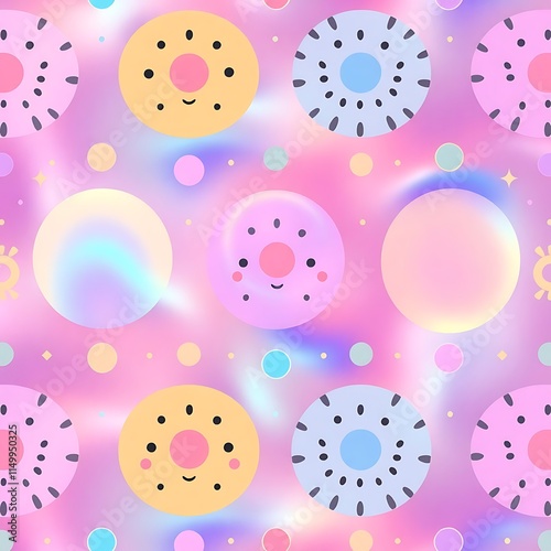 Holographic Cute Circles Pattern: A seamless pattern with cute faces and colorful circles on a holographic background. The pattern is perfect for kids' clothing, accessories, wrapping paper.