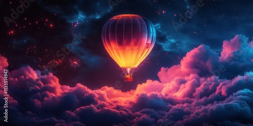 Holographic hot air balloon soaring through luminous clouds, vibrant colors, whimsical atmosphere, enchanting visual experience, dreamlike scenery