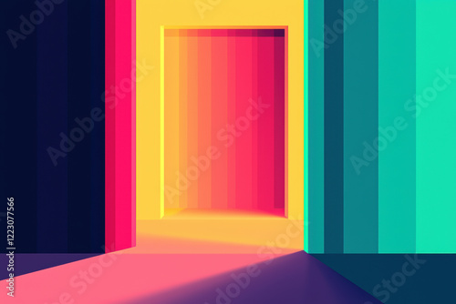 Holographic Innovation Themes dynamic concepts and futuristic designs, A vibrant abstract scene featuring colorful doorways creating an illusion of depth and perspective.