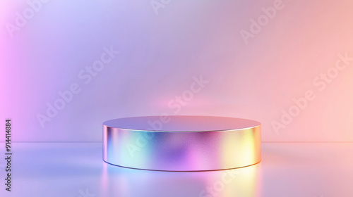 Holographic Podium: A shimmering iridescent platform bathed in a spectrum of neon lights, creating a captivating backdrop for product displays or branding concepts. The platform's reflective surface a
