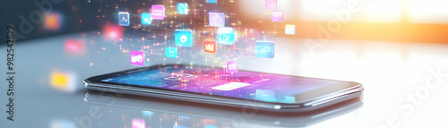 Holographic Smartphone with Floating Demand Icons on Glossy White Background for Financial and Promotional Content - Sleek Modern Design