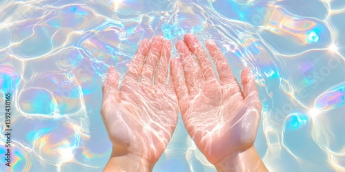 hand, water, holographic, semitransparent, digital, wellness, consumer, protection, mindfulness, healing, serenity, calm, technology, abstract, aethereal, emotional, therapeutic, light, transparent, fluid, relaxation, mental, health, meditation, self, care, inspiration, creativity, soft, gentle, pastel, soothing, zen, tranquil, clean, pure, modern, minimalist, art, intelligence, well-being, harmony, peace