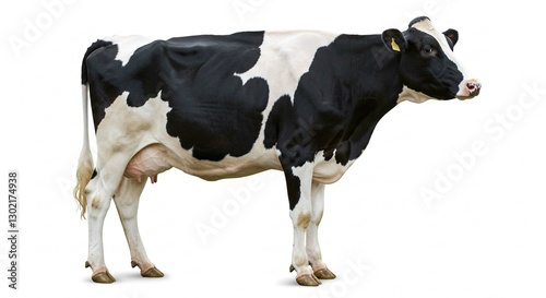 cow, holstein, cattle, dairy, farm animal, black-and-white, isolated, white background, farm animal, agriculture, mammal, animal, farming, bovine, milk, dairy cow, rural, countryside, beef, meat, udder, spotted, healthy, strong, profile, half face, standing, full body, farm, ranch