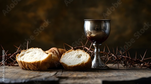 bread, wine, chalice, communion, eucharist, last, dinner, jesus christ, jesus christ, sacrifice, redemption, salvation, faith, belief, christianity, religion, spirituality, holy, sacred, symbol, remembrance, offering, blood, body, life, death, resurrection, hope, love, grace, mercy, forgiveness, peace, calmness, atonement, divine, spiritual, religious, table, wooden, dark, background, thorn, crown