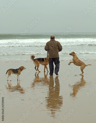 man, beach, sand, sea, horizon, leisure, leisure, surf, dog, puppy, reflexes, three
