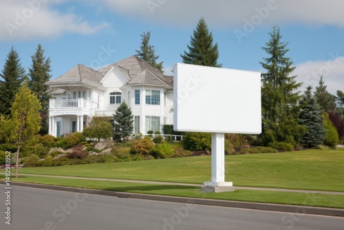house, home, property, estate, building, architecture, luxury, residence, billboard, signs, blank, real, residential, white, structure, exterior, lawn, grass, sky, day, tree, landscape, yard, garden, advertisement, marketing, advertising, promotion, street, road, suburb, suburban, clear, display, sunny
