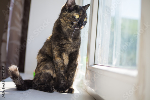 Home cat on the windowsill on a sunny day.