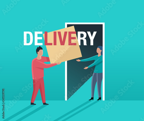 Home delivery concept - couirer stands at the door and brings a parcel to happy woman - vector illustration