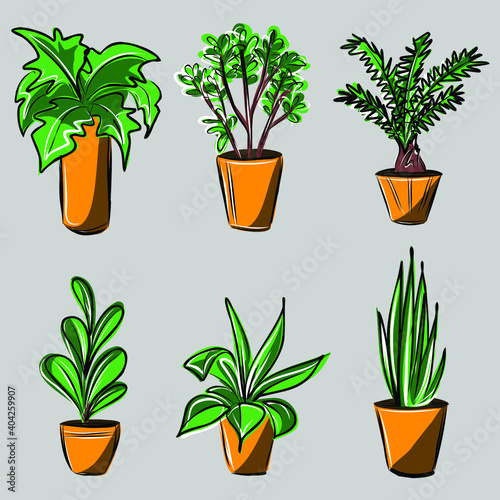 Home flowers in pots. Different types of plants in vases. The interior and decor. Vector isolated image.