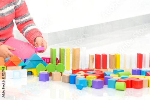Home games for kids. Creative child play with wooden toy building blocks in home during coronavirus.