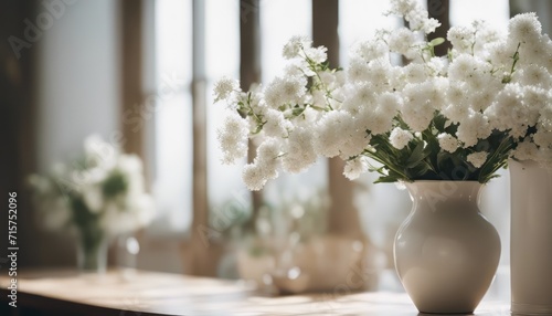 home interior with white flowers in a vase on a light background