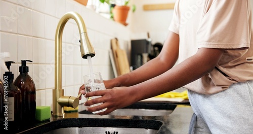 Home, kitchen and hands with tap water in glass for hydration, natural nutrients or thirsty. Mineral, person and pouring liquid at faucet for refreshing drink, wellness beverage and digestive health